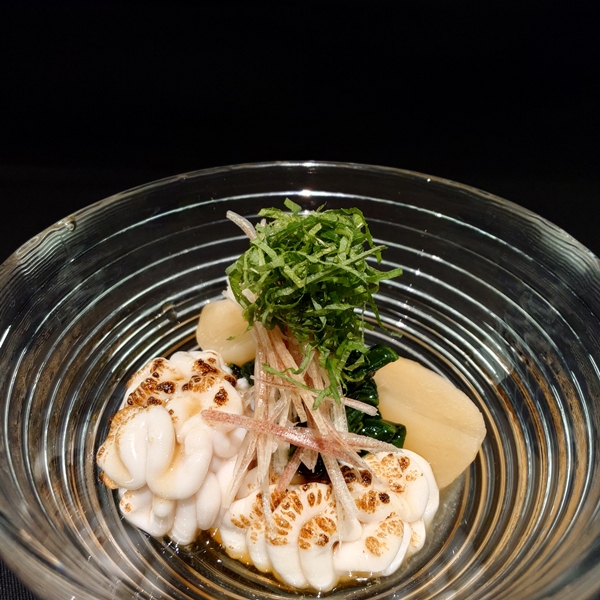 Blanched Seasonal Vegetables and Seared Shirako (Cod Milt) in Dashi Broth